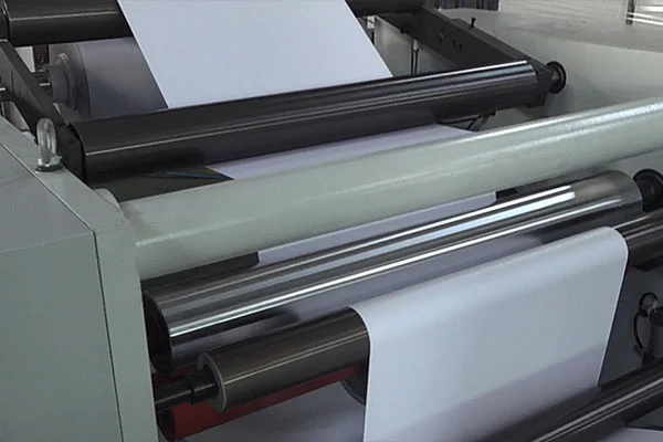 प्रिन्टिङ लाइन उत्पादन: रोल-पेपर अटोमेटिक ल्यामिनेटिंग मेसिनले प्रिन्ट गरिएको वेबलाई पोस्ट-प्रिन्टिङ लाइन उपकरणको रूपमा सीधै कोट गर्छ, प्रिन्टिङ र ल्यामिनेटिङलाई एउटै सासमा महसुस गर्छ।